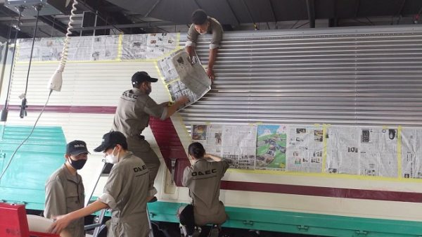 まず、塗装前の準備でマスキングからですが、車体が大きいため、マスキングをするにも大がかり...