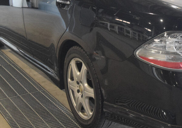 ↑↑使用したのはこちらの車両です。左リヤのバンパーとクォーターパネルに接触した跡があります…接触箇所はへこみ、塗装が剥がれて内側の金属と樹脂が見えています。