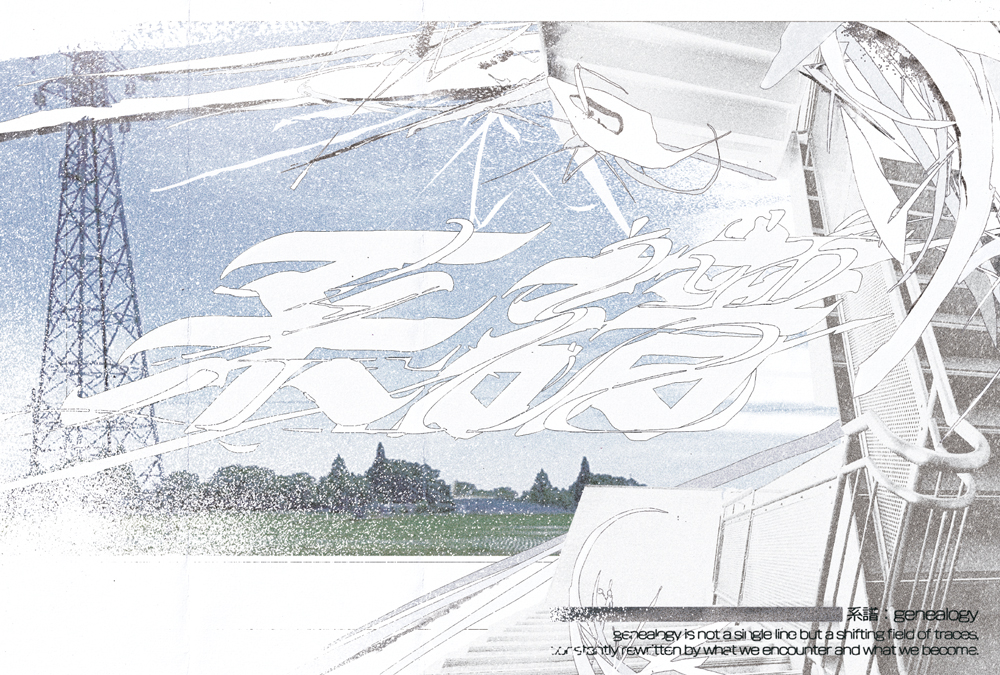 「系譜」というテーマをもとに、時間の流れや繋がりを表現するため、2名の学生がデザインしたロゴを重ね合わせ、連続性や影響の重なりを表現しています。背景には、記憶の積み重なりや時間の経過を感じさせるため、撮影した写真をコラージュし、フィルム特有のノイズや光漏れを加えることで、ノスタルジックな雰囲気を演出しました。